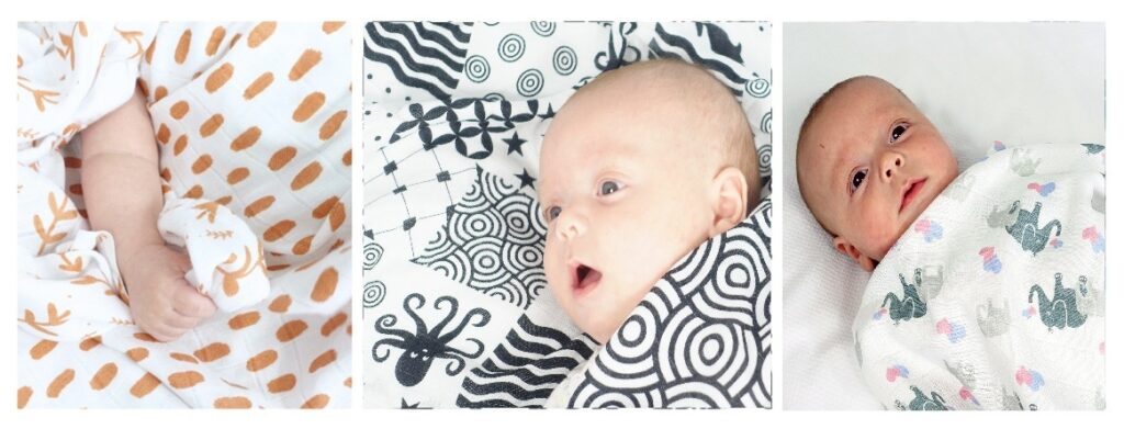 Large 120cms Swaddle size squares – these are perfect for swaddling newborns, can also function as a light-weight blanket, Moses basket sheet, Car seat Blanket, Cover-up for feeding, or as an emergency changing or play mat.